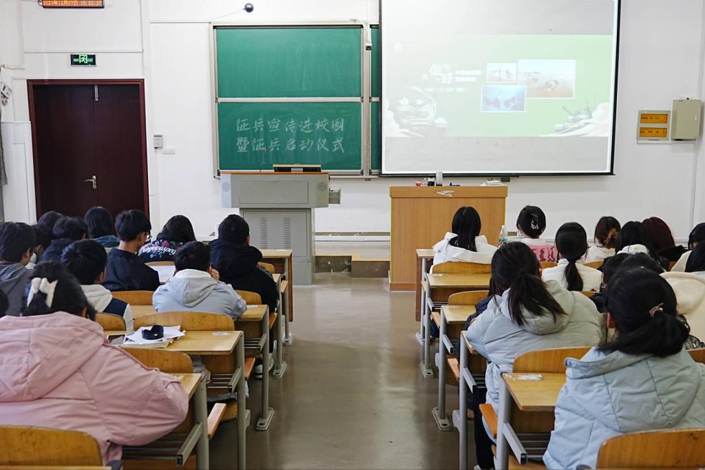 本网讯(见习记者 陈琪睿 刘庆怡 向紫馨/文 郑诗彤/图)为积极响应党和国家号召,激励广大青年投身富国强军伟业。2023年12月7日,经济与管理学院联合一站式学生社区征兵宣传进校园活动暨2024年征兵启动仪式在修远楼5B315教室隆重举行。本次活动以观看线上直播形式展开。