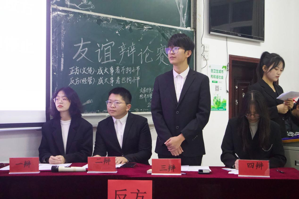 本次辩论赛分为开篇立论、一对一攻辩、攻辩小结、自由辩论、观众提问以及总结陈词六个环节。辩论双方就“成大事者是否拘小节”这一辩题展开辩论。正方文学与传媒学院辩论队持“成大事者不拘小节”观点,反方经济与管理学院辩论队持相反观点。
