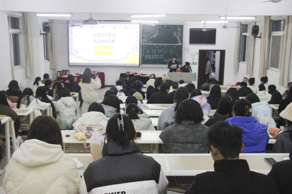 本网讯(见习记者 李如意 叶梦真 余佳怡/文 记者 张玉婷 见习记者 肖雅轩/图)为提高学生的思辨能力和语言表达能力,培养团队合作精神,切实加强校园文化建设。2023年12月15日,经济与管理学院联合文学与传媒学院举办的友谊辩论赛在文瀚楼附102教室举行。文学与传媒学院优秀辩手王珮伊、张秋瑞,经济与管理学院优秀辩手杨丽君、杨兆佳应邀出席本次比赛并担任评委。