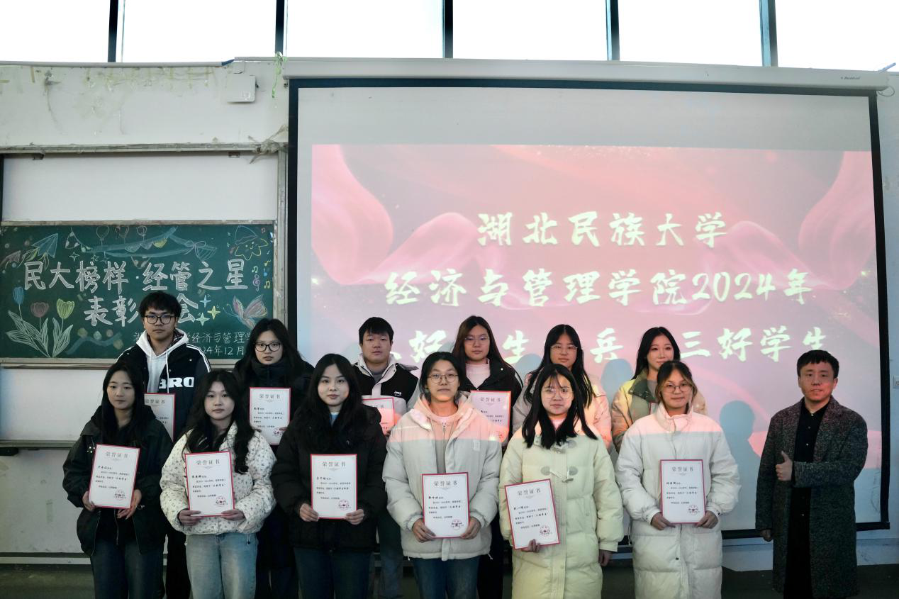 本网讯(见习记者 冯柯嘉 徐彤彤 郭佳/文 记者 郑诗彤 黄俊毅 见习记者 杨语嫣/图)为表彰先进,弘扬优良学风,激励广大学生积极进取。2024年12月19日,经济与管理学院联合“一站式”学生社区举办的2024年“民大榜样·经管之星”表彰大会在修远楼5B403报告厅隆重举行。经济与管理学院院长张新平,MPACC教育中心主任游宇,学生科科长覃杰,旅游管理系教师陈雪娇,学生科辅导员覃雨、杨睿、唐桢坤、亚克甫应邀出席本次大会。覃雨担任本次大会主持人。
