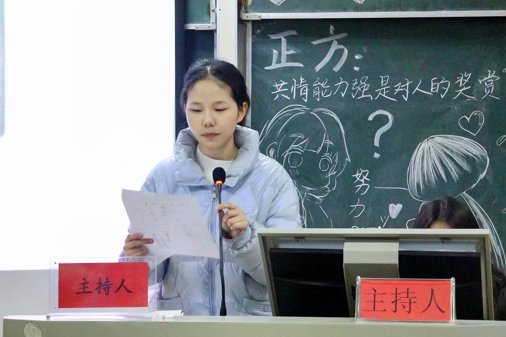 本次辩论赛分为开篇立论、一对一攻辩、攻辩小结、自由辩论、观众提问、总结陈词六个环节。辩论双方就“共情能力强,到底是对人的奖赏,还是惩罚”这一辩题展开辩论。正方经济与管理学院持“共情能力强是对人的奖赏”这一观点,反方法学院持相反观点。