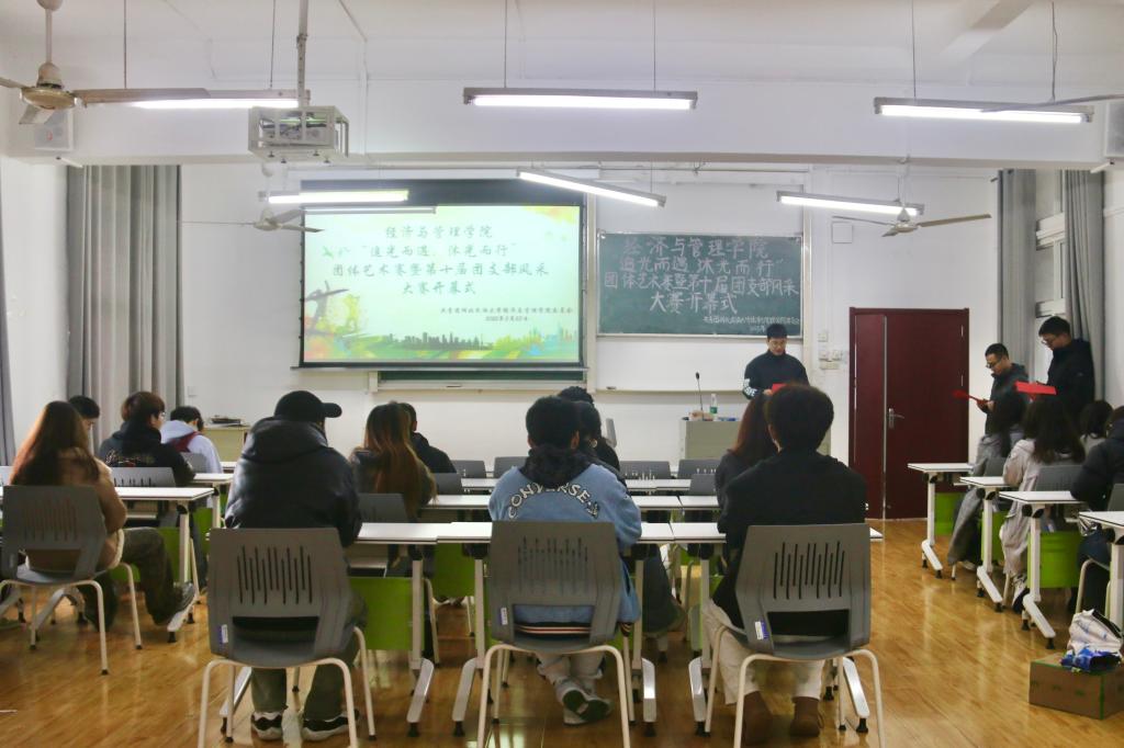本网讯(见习记者 苏燕康 郭佳/文 记者 郑诗彤/图)2025年3月23日,经济与管理学院联合“一站式”学生社区以“追光而遇 沐光而行”为主题的团体艺术赛暨第十届团支部风采大赛开幕式在文瀚楼1302教室举行。经济与管理学院团委书记杨睿,学生科辅导员唐桢坤应邀出席本次活动。杨睿担任本次活动主持人。