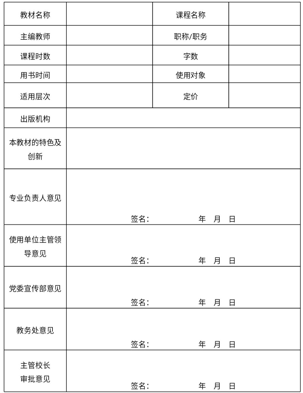 严格按照学院、学校两级审批程序办理。每学期教务处发布教材征订信息,各学院按要求将所开设课程选用教材汇总后经分管领导签字报教务处。