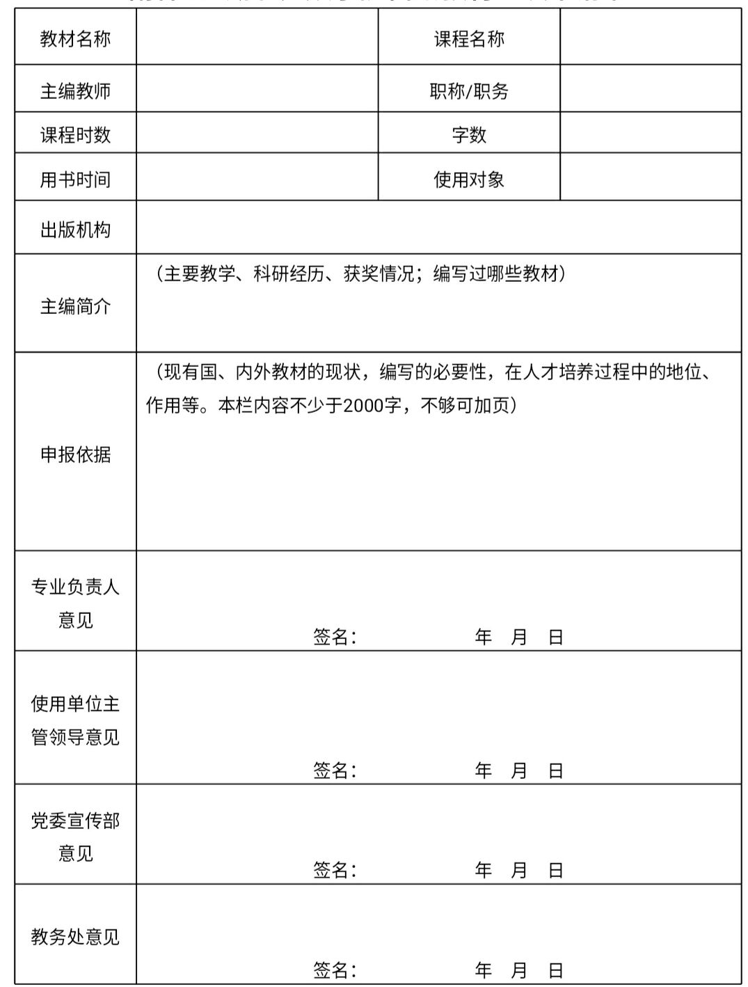 (一)自编教材提交使用时,由主编教师和使用单位提出申请,填写《湖北民族学院自编教材使用申报表》(附件2),经专业负责人和所在学院主管领导同意,连同自编教材电子版和样书交教务处。