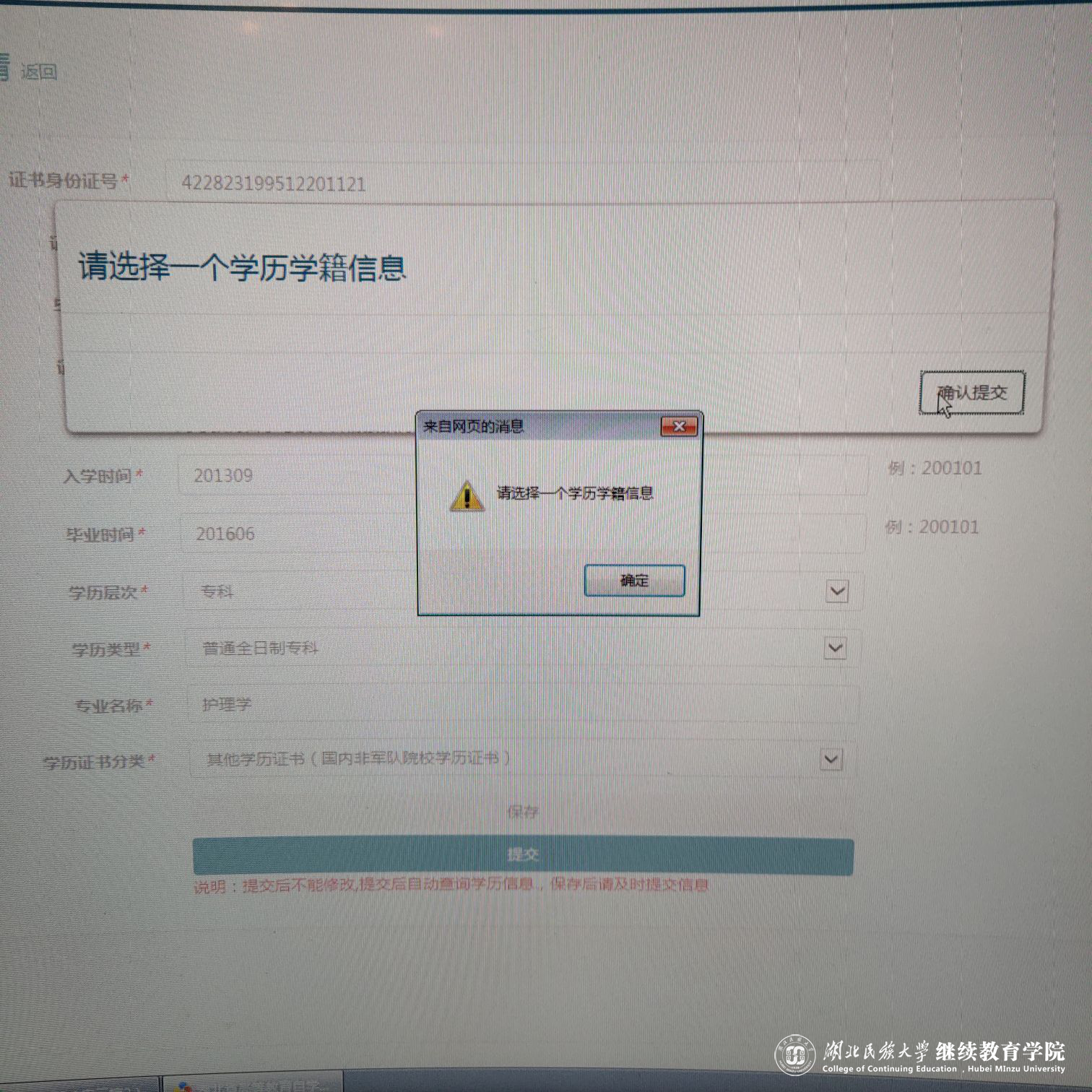 以下页面中注意:选择学历证书为“学历普通专科”,不能是“学籍普通专科”!!!没有学籍普通的在前置学历管理里提交。