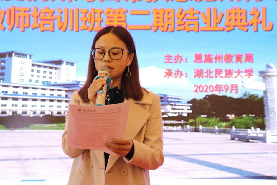 9月29日,恩施州村级小学教师第二期培训班结业典礼在华龙村大酒店宴会中心举行,来自全州八县市的300名村级小学教师参加了结业典礼。结业典礼按班分别在宴会中心三楼多功能会议室一号厅、二号厅、二楼会议室举行,典礼由各班班主任主持举行。