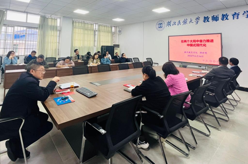学校党委委员、教师教育学院党总支副书记、院长谭世明以《在两个大局中奋力推进中国式现代化》为题,从“如何理解和认识百年未有之大变局”“如何理解和认识中华民族伟大复兴战略全局”“如何理解和认识中国式现代化”三个方面为支部全体党员上二十届三中全会专题党课。
