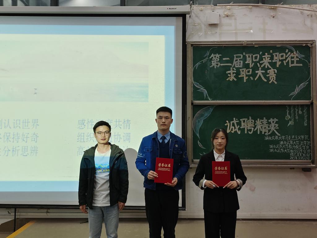 本网讯(通讯员 肖倩娥)为了增强大学生职业规划意识、创业意识,竞争意识,引导广大学生自觉树立正确的成才观、择业观和就业观,教师教育学院、法学院、马克思主义学院、林学园艺学院团总支素质拓展部联合举办第二届“职”来“职”往求职大赛,决赛于2023年10月28日下午七点整在修远楼5B404举办决赛,教师教育学院团总支书记李志刚、研究生处辅导员向鑫、马克思主义学院专职教师姜素凤、林学园艺学院团总支书记刘蒙恩参加了本次决赛。