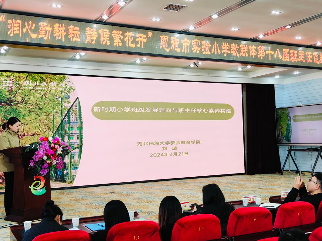 论坛以“润心勤耕耘,静候繁花开”为主题,围绕班级管理实践展开讨论交流。学院教师刘璇博士以《新时期小学班级发展走向与班主任核心素养构建》为题作交流发言,恩施实验小学班主任代表围绕因材施教、团体育人以及家校沟通与协作等内容分享了班级管理实践育人故事。