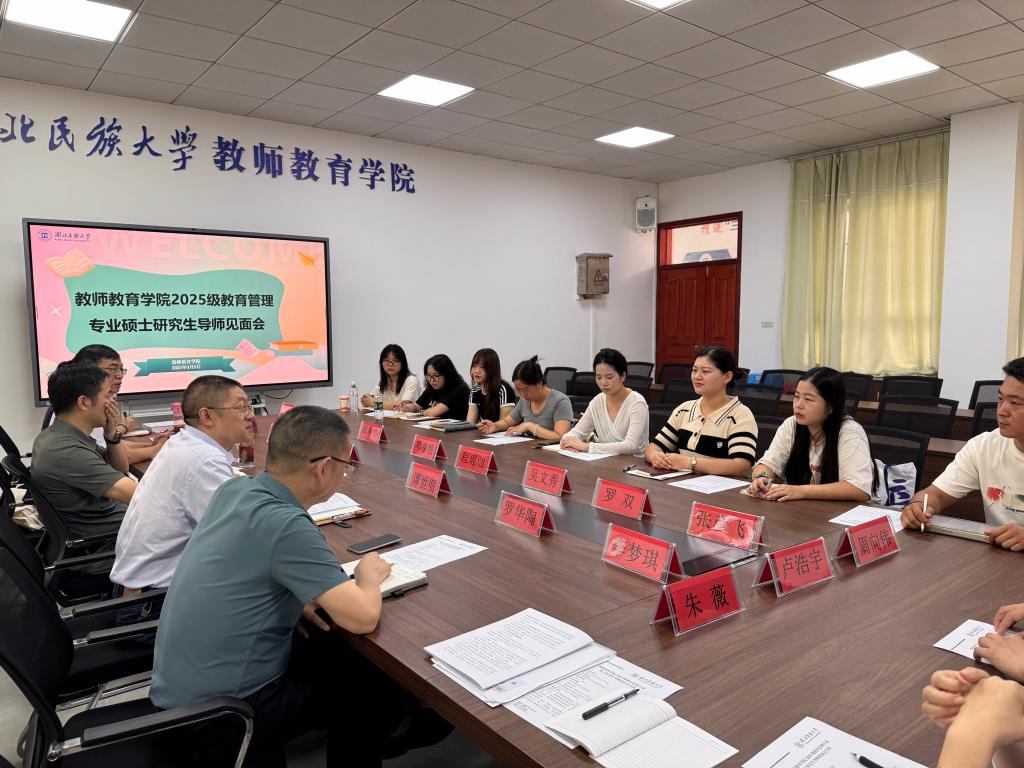 9月5日上午,我院在9A505会议室召开2025级教育管理专业硕士研究生导师见面会。院长谭世明、党总支书记宁华宗、副院长邱世兵,教育管理专业全体导师及研究生参会,会议由副院长黄力主持。黄力首先领学了习近平总书记关于研究生教育及黄大年同志先进事迹的重要指示批示。谭世明介绍了学校和学院的基本情况,对全体研究生新生进行了爱校爱院教育。他对我院首届研究生的到来表示热烈欢迎,并从多年指导研究生的经验出发,期望各位硕士研究生迅速适应新角色,提出了“五个一”的学习要求(即读一本书、发表一篇学术论文、完成一篇学位论文、参加一次省级以上学术交流活动、做一次学术报告)。接下来,教育管理专硕的导师依次介绍了各自的研究方向,并对研究生提出了学习要求。全体硕士研究生也逐一进行了自我介绍。通过师生间的互动交流,进一步加深了对彼此的了解。最后,党总支书记宁华宗进行总结发言。他鼓励研究生们要“有目标、有信心、有底气”,送给学生三句话:“放得下书台、站得上讲台”“管理是一门技术,更是一种情愫”“当‘大先生’,做‘小学生’”,并向全体硕士导师和研究生赠送了学院文创纪念品。