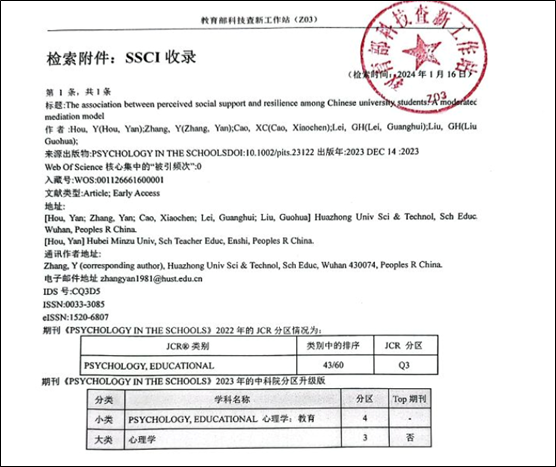 我院教师、华中科技大学在读博士生侯燕的论文《The association between perceived social support and resilience among Chinese university students: A moderated mediation model》(第一作者)发表在《Psychology in the Schools》(IF=1.8,SSCIQ3)。