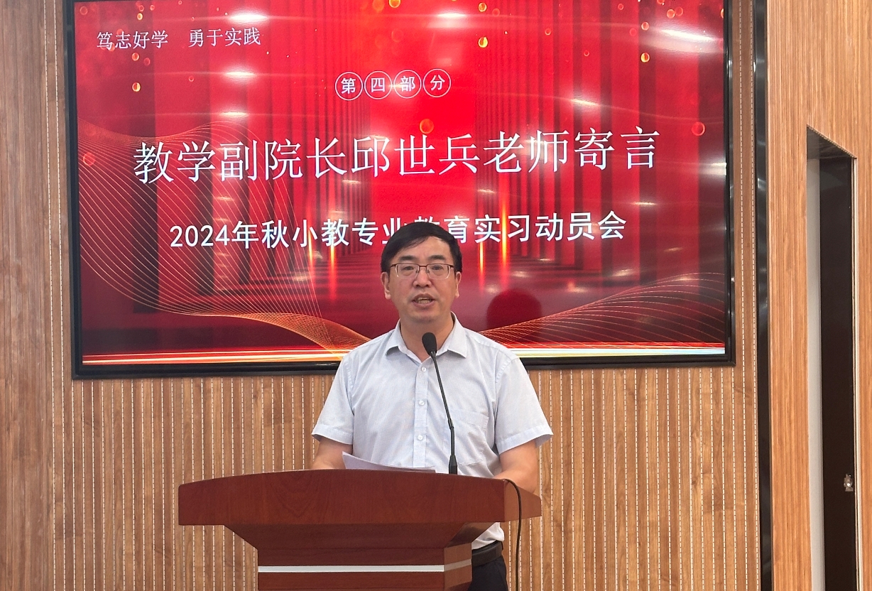 会上,副院长邱世兵结合自身实习经历,向同学们分享了以学生为中心的教育理念和反思与成长的教育哲学。他激励同学们直面实习挑战,把实习当作成长的宝贵机会,并期待同学们在实习中取得丰硕成果。协同育人办公室主任郑奇鼓励同学们以积极心态投入实习,体验师德,形成真实认知。实习生代表雷伏链向学院、实习学校以及老师们表达衷心的感谢,号召同学们抓牢实习机会,锻炼教学技能,提升综合素养。党总支副书记曹骞勉励同学们要在实习中沉浸式体验教育的魅力与挑战,充分展示师范生的技能和素养,为未来教师职业生涯打下坚实的基础。