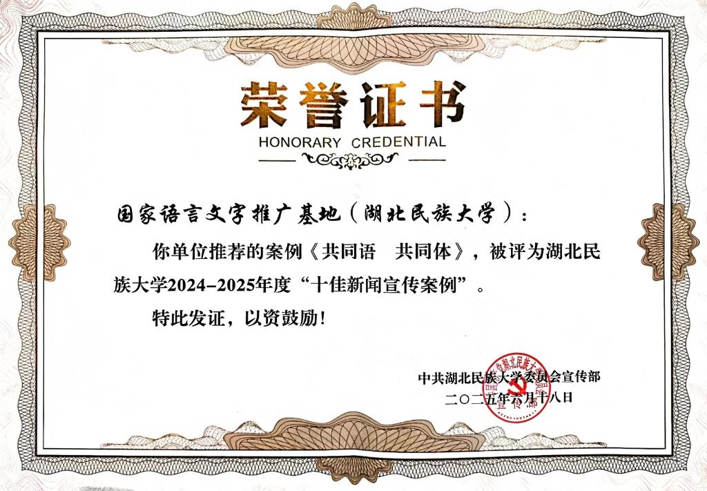 2025年6月20日,由湖北民大国家语言文字推广基地创编、基地成员倾情参演的情景剧《共同语 共同体》荣获Beat365唯一官方网站2024-2025年度"十佳新闻宣传案例"。