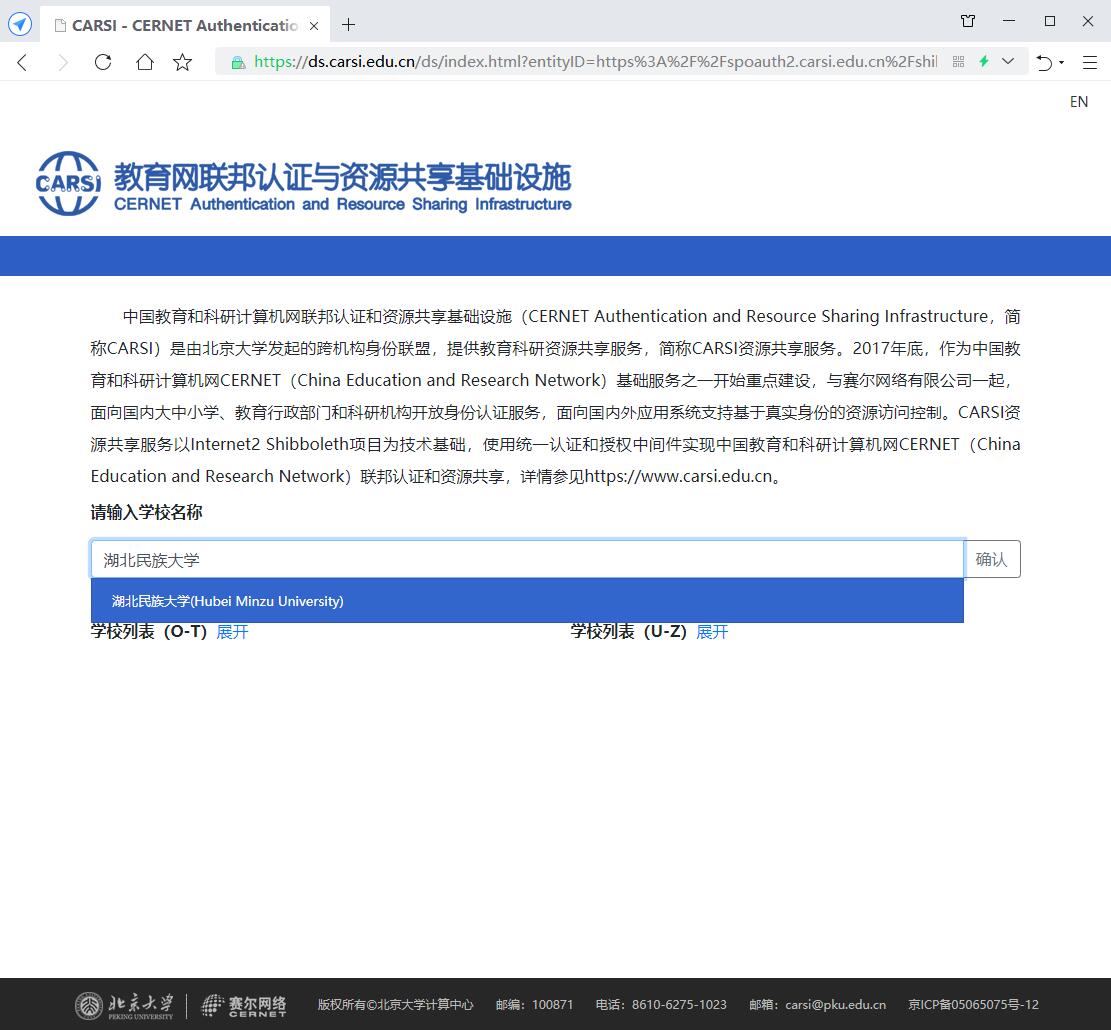 2、进入CARSI机构联盟学校页面,选择所在学校,Beat365唯一官方网站。