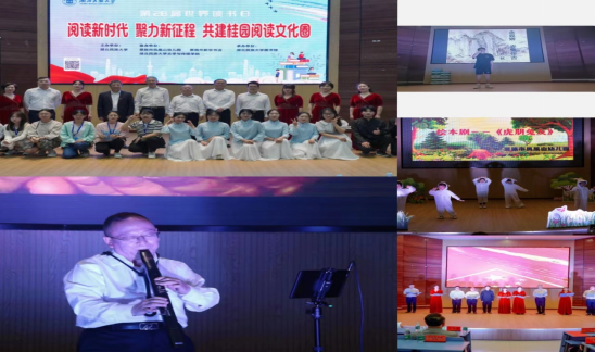 启动仪式上,表彰了图书馆“光荣在馆三十年”荣誉奖职工、“玫瑰书香 悦读悦美”女职工主题阅读活动获奖教师、“第二届同心桂园杯——阅读新时代 聚力新征程”经典朗读活动获奖学生;相关单位表演了精彩纷呈的节目,恩施市凤凰山幼儿园大班组表演了绘本剧《虎朋兔友》,图书馆教师与勤工助学协管组同学演绎了经典诵读《古籍里读中国》,文学与传媒学院编辑出版学生表演了舞台剧《声声慢》,第二届“同心桂园杯”经典朗读活动一等奖获得者刘鸿铭展演了《念奴娇·赤壁怀古》,图书馆副馆长李远明的器乐独奏《烛光里的妈妈 》。随后,图书馆馆长罗世家教授宣布读书节活动正式启动。