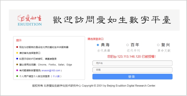 经联系,现开通“爱如生中国医学库(原名中医典海)”的试用