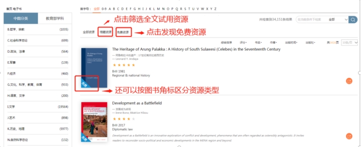 Ø 点击“馆藏资源”标签,该栏目下为此次开放阅读的图书,每本图书带“试用”角标,读者可实时在线打开电子书进行翻阅;“开放资源”标签下显示的是平台全部OA免费资源,同样可以阅读全文;“全部资源”标签下另含平台其他未开放的图书,每本书可试读5~20%的内容。