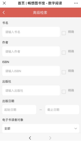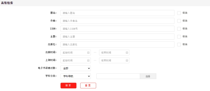 各个终端可以在检索入口输入题名、ISBN、作者、出版社等检索词查找资源,需要多个条件同时查找可以通过高级检索实现精确检索。