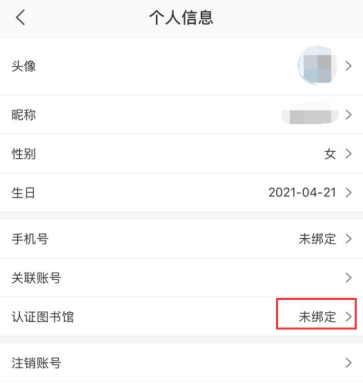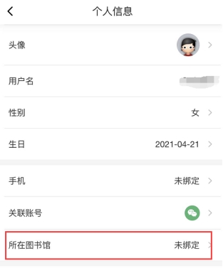 2) 登录成功后进入“个人中心”页面,找到“当前图书馆/所在图书馆”是否显示未绑定,如果显示未绑定,需要绑定读者所属图书馆。