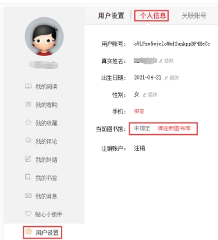 PC端-首页右上角个人中心-用户设置-个人信息-当前图书馆绑定