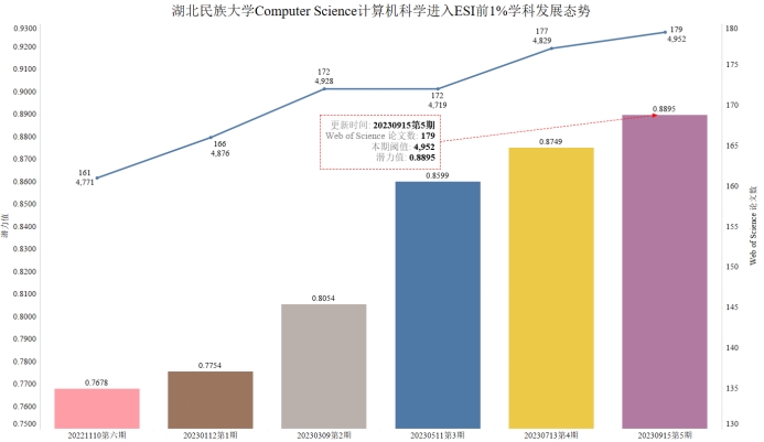 本期Beat365有望进入ESI前1%的学科为Computer Science 计算机科学,潜力值为0.8895,论文数179,引用量4405,本期入围阈值为4952。
