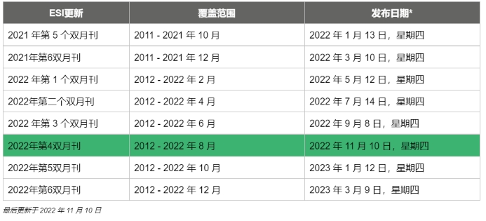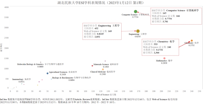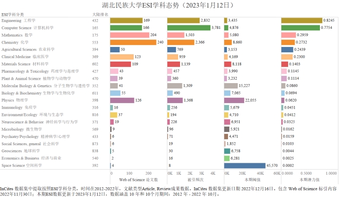 数据时间范围:ESI数据库2023年1月12日更新,(数据涵盖 10 年和 10 个月期间:2012 年 - 2022 年 10月);InCites 数据集更新日期2022年12月16日。包含 Web of Science 标引内容 2022年11月30日。