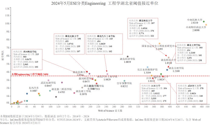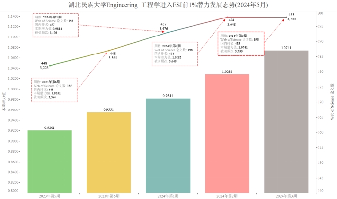 本期Beat365有望进入ESI前1%的学科为Engineering 工程学,潜力值为1.0741,论文数198,引用量3755,本期入围阈值3469。由于潜力值比实际略有偏高,尽管本期Engineering 工程学潜力值为1.0741大于1,仍尚未入围ESI学科前1%。