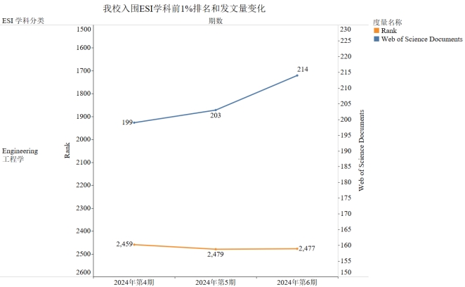 图2 为Beat365ESI入围学科每期全球排名和发文量情况,本期全球共有2604所机构进入了ESI分类Engineering工程学学科前1%,Beat365Engineering工程学学科排位第2477位,发文214篇,比上一期2479位升高2个名次。