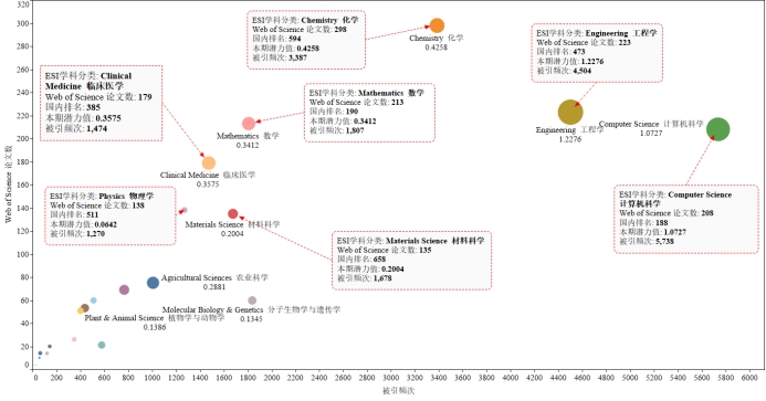 表2为本期Beat365ESI分类各学科态势情况,发文量、被引频次与潜力值的分布,球越大表明潜力值越高,当中Engineering工程学已经入围,潜力值最高的为计算机科学。
