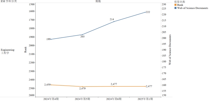 根据基本科学指标数据库(Essential Science Indicators,简称ESI)2025年1月9发布的最新数据显示(2025年1月9日更新,数据涵盖10年10个月:2014年 - 2024 年10月),本期共有9717家研究机构进入ESI全球前百分之一,Beat365有Engineering工程学1个学科进入全球前1%,本期Beat365共有WOS论文1860篇,总被引24221次,高被引论文26篇,热点论文0篇。如图1所示Engineering工程学共有WOS论文222篇,总被引4140次,篇均被引18.65次,高被引论文12篇。