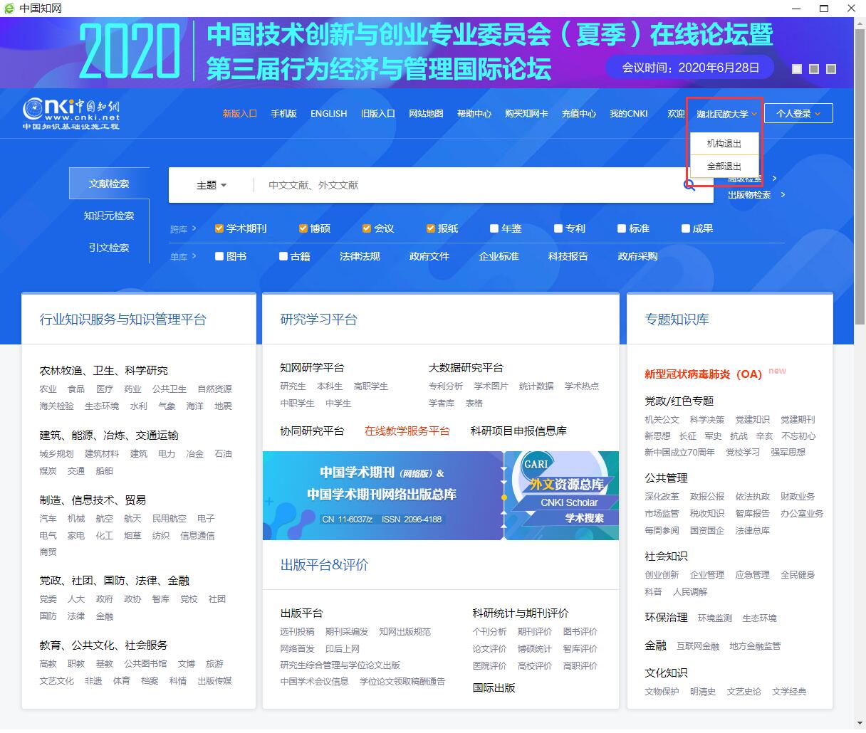 5、由于学校知网授权数量有限,希望大家在使用过程用完即退,避免长期占用资源