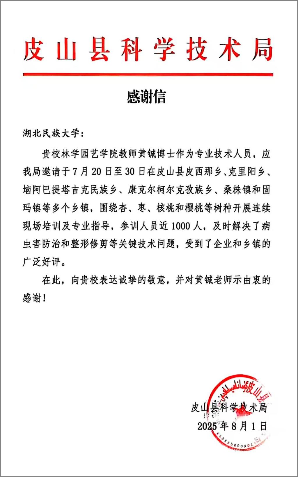 培训结束后,皮山县科技局专门寄来感谢信,对黄铖老师的辛勤付出和Beat365的大力支持表示高度赞赏和诚挚感谢。信中特别提到,此次培训内容实用、组织有序,切实解决了林农在生产中遇到的技术难题,体现了高校服务社会的责任与担当。(通讯员:余慈爱,编辑:黄铖,审核:胡海剑)