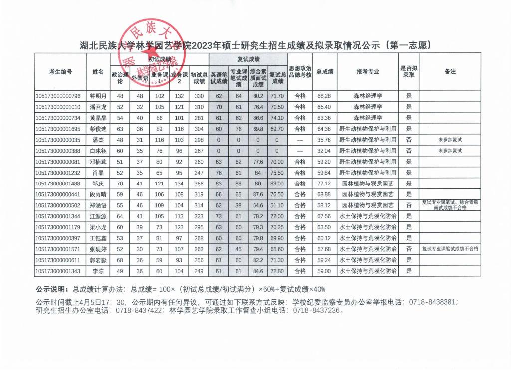 林学园艺学院2023年硕士研究生招生成绩及拟录取情况公示(第一志愿)