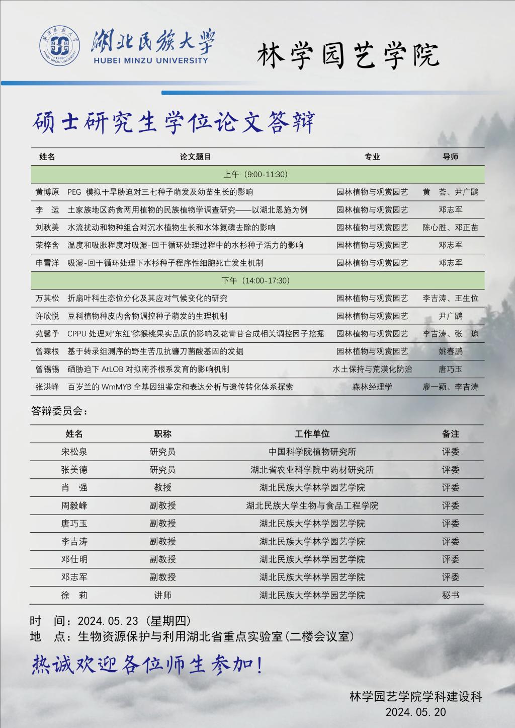 林学园艺学院2024届硕士研究生学位论文答辩公告(一)