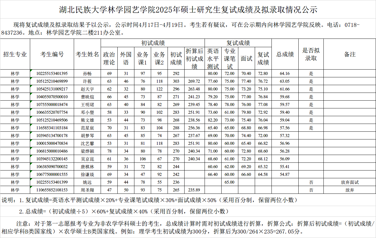 林学园艺学院2025年硕士研究生招生复试成绩与拟录取名单公示(第二轮调剂)
