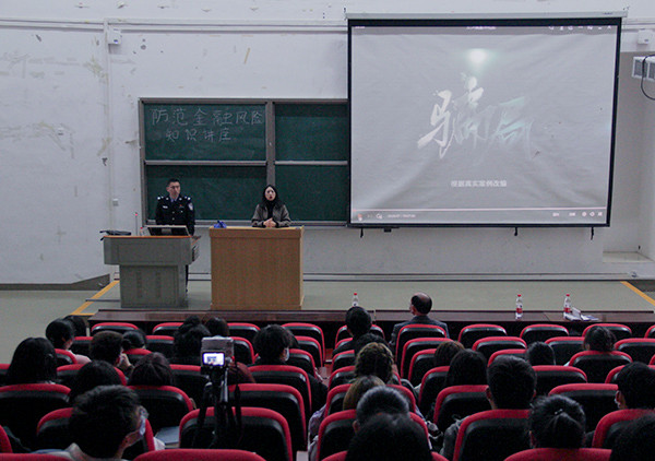 本网讯(通讯员 杨玉莹 姜依维 王思雨/文 阮欣欣/图)为提高学生防范金融风险的意识,学习防范金融风险的相关知识尤其是防范网络诈骗相关知识。3月25日下午,我院与美术与设计学院共同在修远楼5A207教室举办防范金融风险主题讲座。恩施市土桥坝派出所王烁警官担任主讲人,校保卫处老师谢整文、李前银以及美术与设计学院辅导员胡杰、我院辅导员黄晶晶应邀出席,我院与美术与设计学院全体班长及寝室长到场参加。