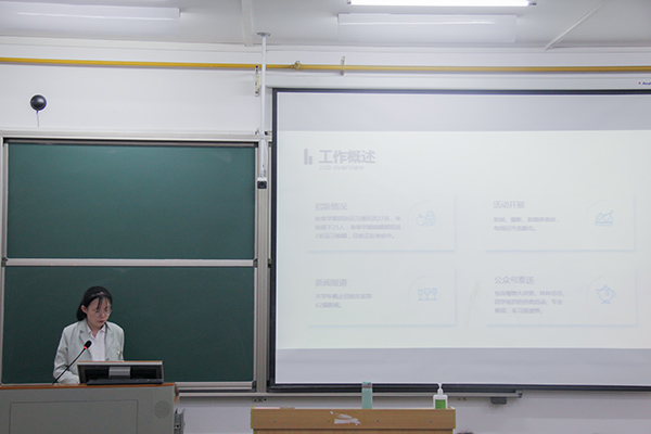 会议伊始,社长刘鑫淼作学年总结。她对各部门工作进行概述,并汇报了2020年度通讯社工作成果。接着黄晶晶做指导讲话。她表示通讯社是一个充满凝聚力的集体,通讯员应继续努力,将通讯社发展得更好,同时也对通讯社成员的辛勤付出表示感谢,对新一届通讯社成员充满期待。随后,参与竞职的通讯员依次上台进行演讲。