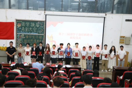 刘蒙恩老师宣读五四表彰名单,并主持颁奖仪式。随后,秦松老师宣读了新一届团学干部任职名单,对全体团学干部在工作中展现的责任意识与担当精神给予充分肯定,肯定了团学干部们以实际行动践行使命,为学院团学工作的发展作出的积极贡献,充分发挥了示范引领作用,并与刘蒙恩老师、邢续净老师共同为新任干部颁发聘书。