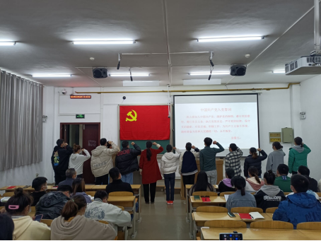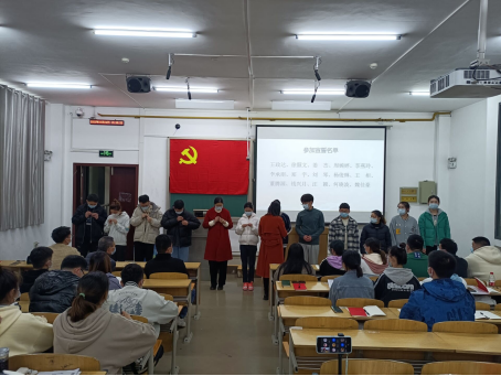 大会伊始,全体肃立,奏《国际歌》。随后由黄晶晶宣布参加宣誓的15名预备党员名单,并为预备党员颁发党徽。之后在领誓人刘蒙恩的带领下,预备党员面向党旗庄严宣誓,立下承诺,愿为共产主义事业奋斗终生。