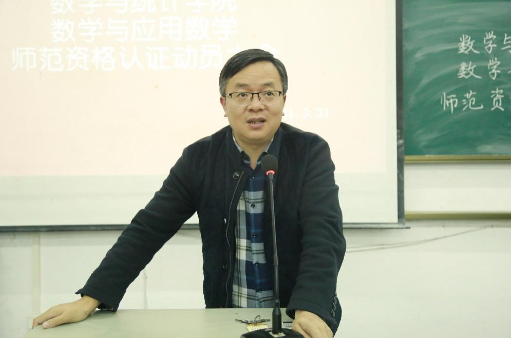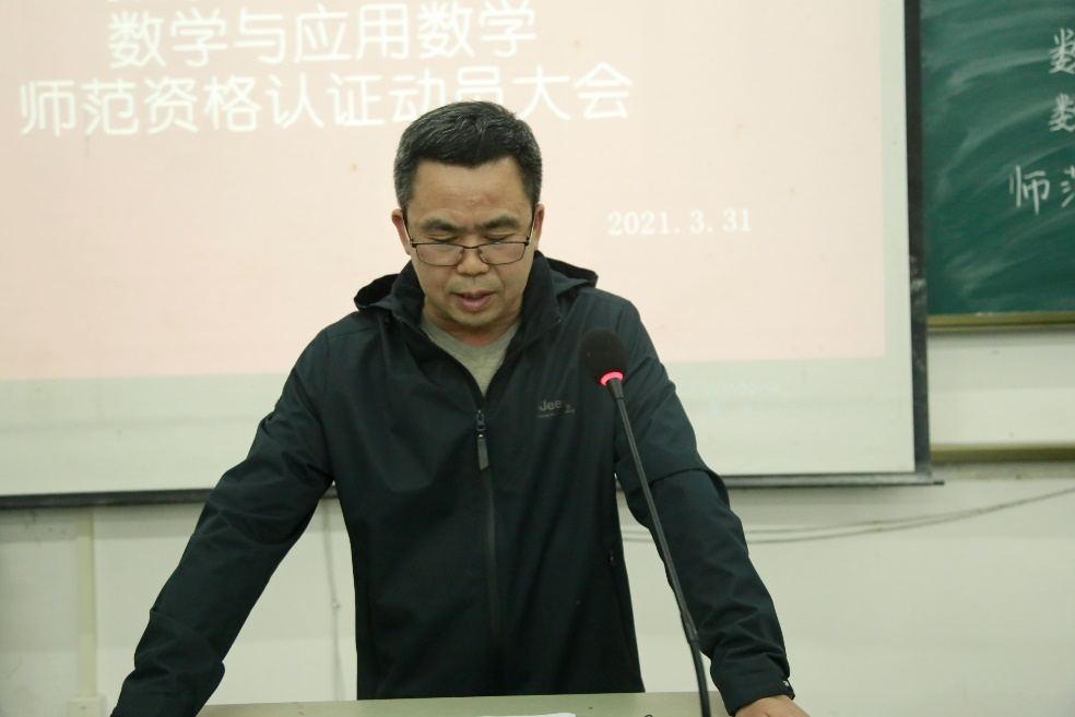本网讯(记者 孙梦 见习记者 朱康乐/文 李一鸣/摄)3月31日晚,我院数学与应用数学专业在3308教室进行师范专业认证动员大会。我院党总支书记赵魁轩,院长刘志军教授,副院长魏代俊教授、唐利明副教授,专业认证办公室主任及数学与应用数学系主任向中义教授、副主任谢君辉副教授,办公室主任罗琼老师,学生科科长谭迪老师,教学科副科长姚雪迓老师出席本次会议。2018级、2019级、2020级数学与应用数学专业全体学生参加本次大会。