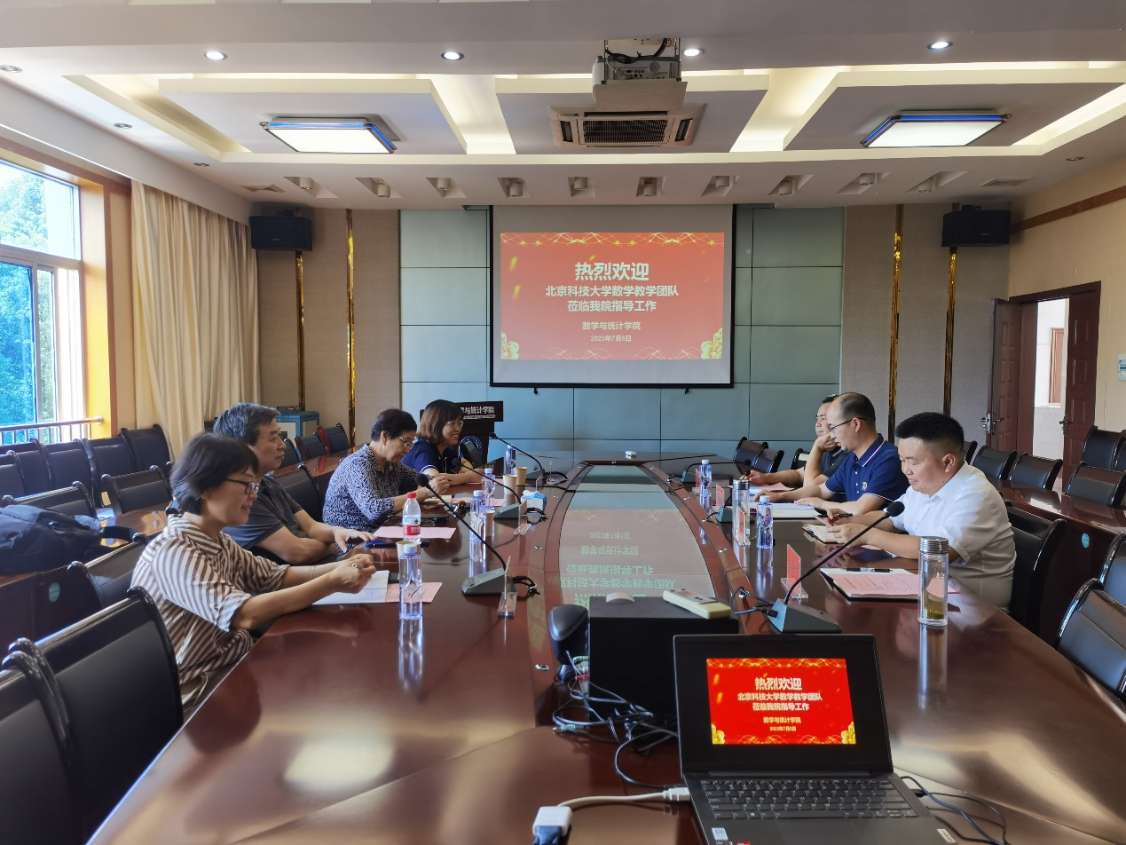 75日下午,北京科技大学数学教学团队张志刚教授、范玉妹教授、刘秀芹教授、苏永美教授一行来我院调研交流。学院院长魏代俊教授、副书记易金桥教授、数学系主任向中义教授、统计系主任向会立教授接待张志刚教授一行。