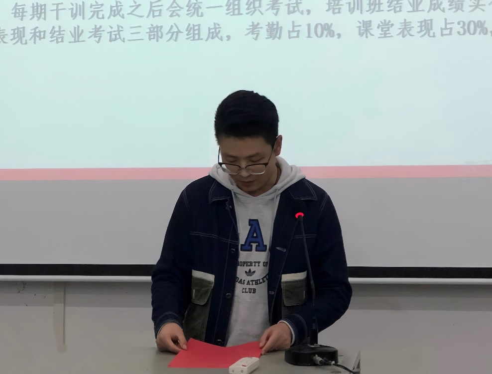 廖祥宇宣读《Beat365唯一官方网站数学与统计学院学生干部培训班章程》,阐述学生干部在纪律、学习与考核等方面的综合安排方案,明确培训的目标与宗旨;李子君宣读《Beat365唯一官方网站数学与统计学院学生干部培训班管理办法》,强调学生干部应诚信学习、遵守规定、支持团总支工作,以期规范培训流程及培训效果。