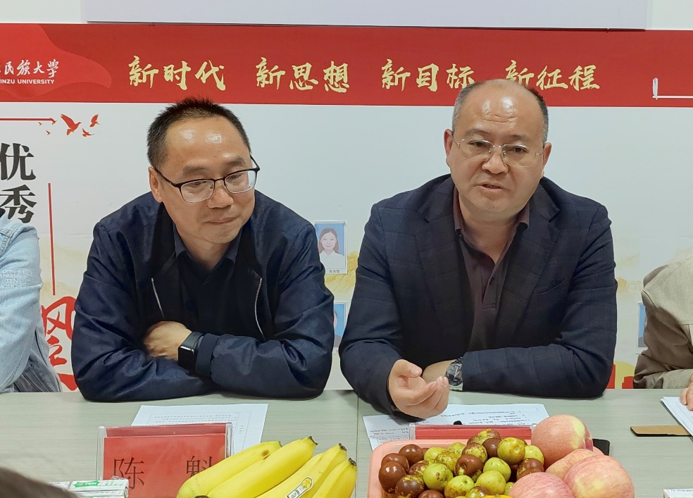 谭学文和陈魁展开“老师讲一讲”主题宣讲环节。陈魁老师提出三点要求:一是吸取有益营养,加强各民族交往、交流、交融;二是在困难中寻求办法,培养自信气质;三是深刻领会“三个离不开”,即汉族离不开少数民族、少数民族离不开汉族、各少数民族之间也互相离不开。谭学文老师从学会珍惜、民族交融、学会规划、锻炼身体、学会感恩五个方面为疆籍学生的学习生活建言献策。