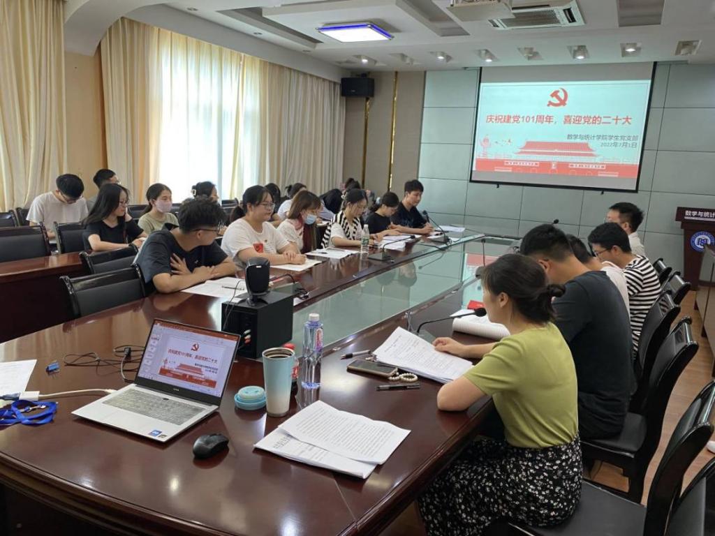 为了迎接党的二十大的召开,为了庆祝建党101周年。2022年7月1日,我院学生党支部在数学与统计学院四楼会议室召开党员大会,开展“庆祝建党101周年,喜迎党的二十大”为主题的支部主题党日活动。会议由支部书记黄丽娜同志主持。