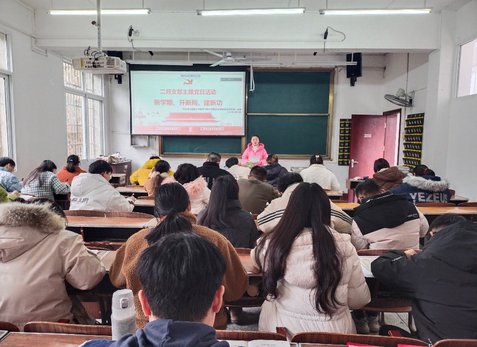 2024年2月29日下午,数学与统计学院学生第一党支部在3205教室举办“新学期、开新局、建新功”支部主题党日活动。本次活动由支部书记黄丽娜同志主持。