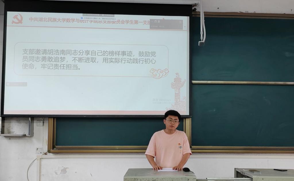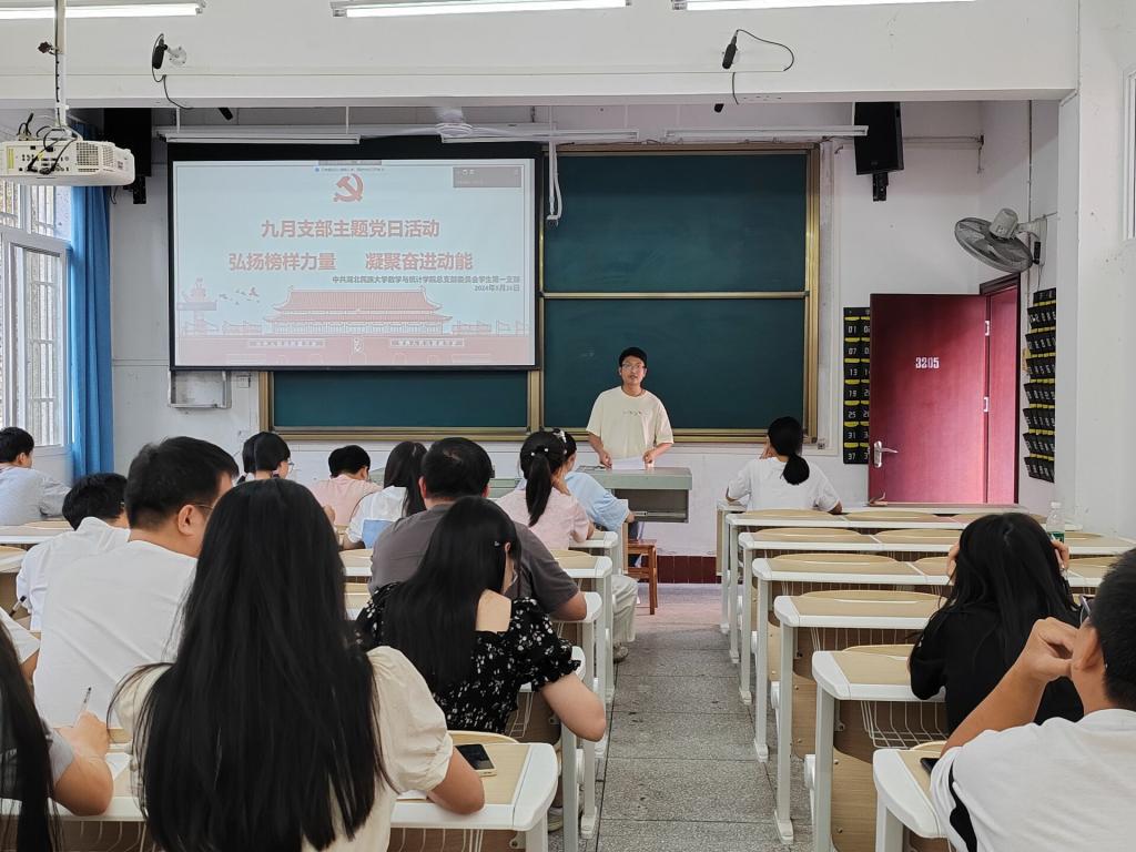 本网讯(记者 谢铭 闵小玉/文 谢铭/摄)2024年9月26日下午,数学与统计学院学生第一党支部在3205教室举办主题为“弘扬榜样力量,凝聚奋进动能”的9月支部主题党日活动。本次活动由学生第一党支部书记廖祥宇主持。
