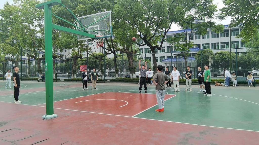 “定点投篮”比赛开始前,参赛队员争分夺秒、紧锣密鼓地进行了投篮练习。赛场上队员们站在投掷点,精神饱满,神情专注,动作如行云流水、一气呵成。赛场上洋溢着欢快的气氛。