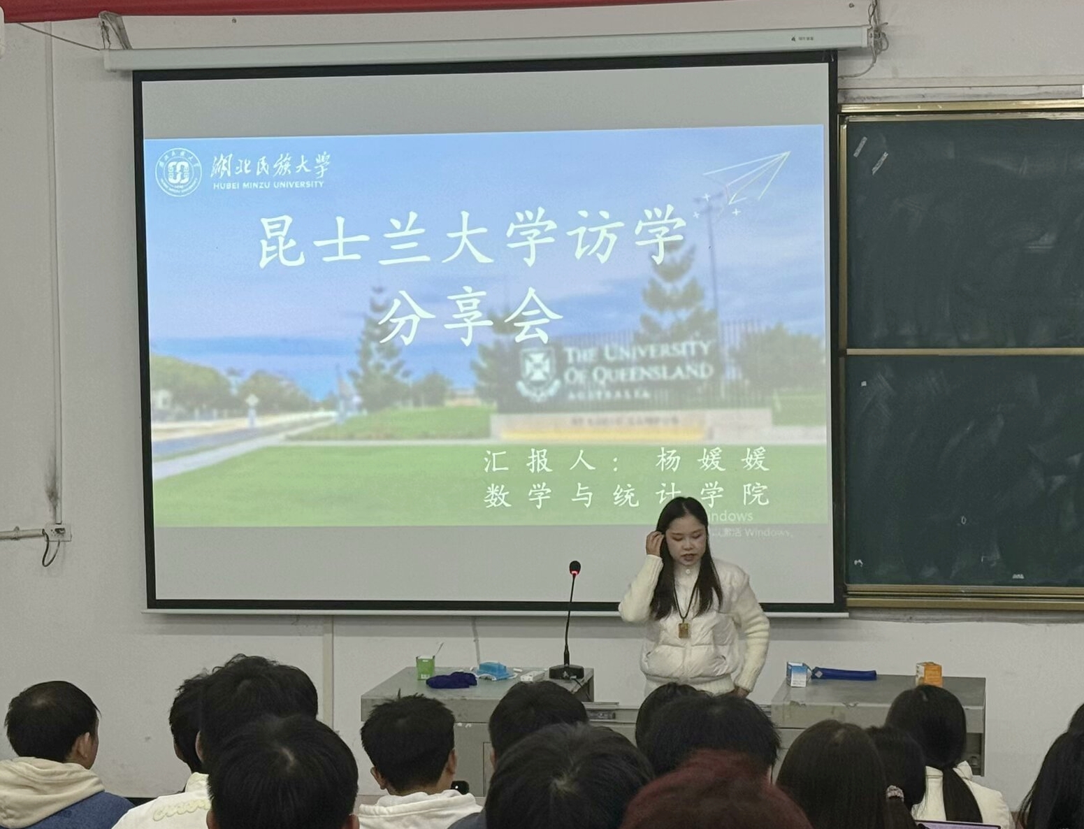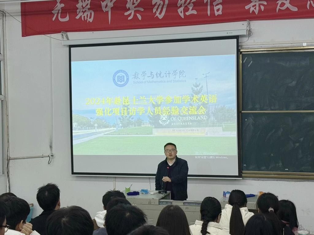 2024年11月27日晚,数学与统计学院研究生访学澳洲回国经验分享交流会在3308教室召开。本次会议由第五届研究生会办公室副主任班苗苗主持,向会立院长、王清龙老师以及周雄老师莅临指导,研一、研二全体学生参加。