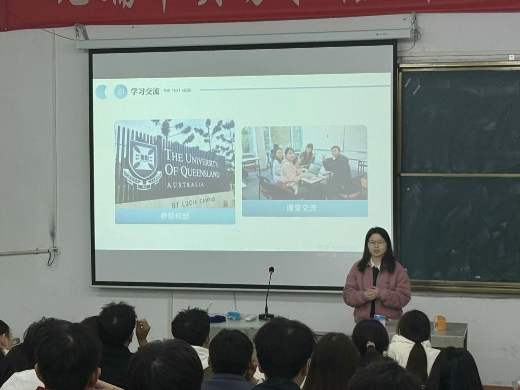 随后,由其中三位从澳大利亚访学归来的同学分别就此次访学经历进行经验、收获的分享和交流。陈梦娇同学以“学习篇”和“生活篇”为主题,深入而生动地分享了她在澳洲访学期间的独特经历与感悟。她特别强调了勇于开口、主动表达在国际交流中的重要性。她鼓励大家在国际交流中克服语言障碍,积极提问和参与,打开全新的学习模式。