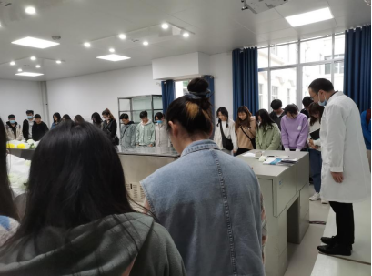 最后,谭刚老师和我院团总支书记刘聪老师带领学生有序进入解剖室参观。在参观期间,由医学部人体解剖学教研室谭文波老师、王振富老师以及李震阳老师负责对学生们进行详细的解说并和学生一起举行默哀仪式。讲解老师为学生讲解遗体捐赠等相关知识,分享各藏品及背后的故事。在人体解剖室内,讲解员为学生展示人体脑部、胸部、腹部等各种切片以及各时期人体器官标本,让学生从人体的基本结构和器官的病变等方面有更深刻的了解。